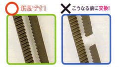 タイミングベルトが劣化し、破断または位置ズレが発生するとエンジンが動作不能となり、即走行不可となります。ほとんどの場合、エンジン内部、バルブ周りが破損し大掛かりな修理が必要となります。
